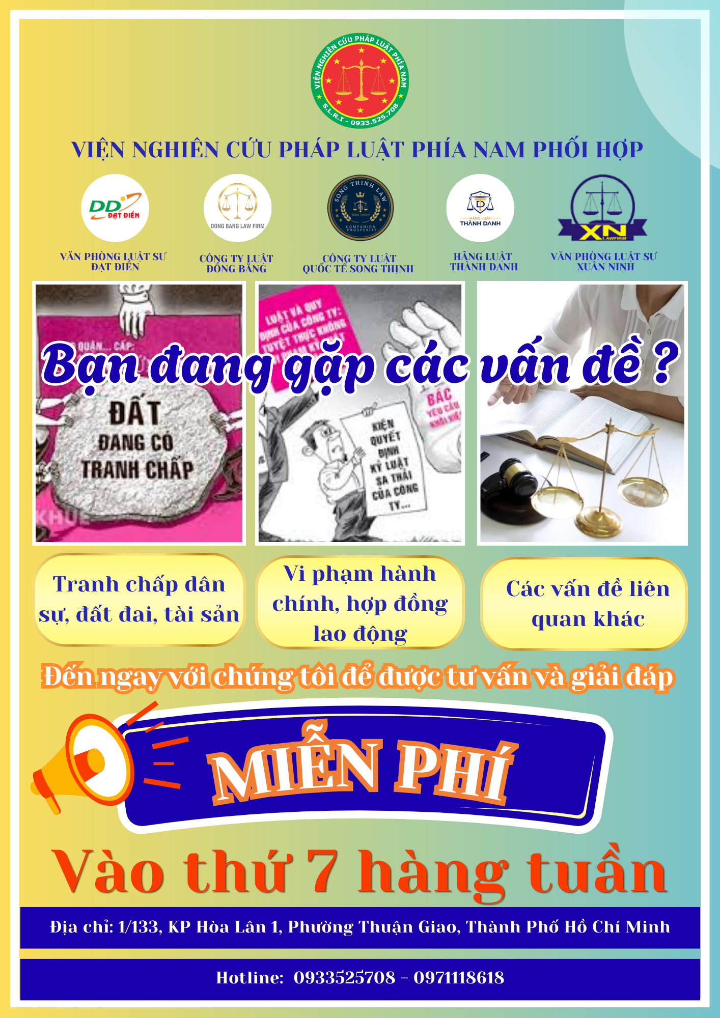 SLRI – Nhằm thực hiện chương trình Tuyên truyền, phổ biến kiến thức pháp luật đến người dân. Kể từ tháng 9 năm 2025, Viện Nghiên cứu Pháp luật Phía Nam phối hợp với Công ty Luật Quốc tế Song Thịnh, Công ty Luật Đồng Bằng, Hãng Luật Thành Danh, Văn phòng Luật sư Xuân Ninh và Văn phòng Luật sư Đạt Điền triển khai chương trình “Tư vấn pháp luật miễn phí cho người dân”, diễn ra định kỳ vào thứ 7 hằng tuần. Đây là hoạt động có ý nghĩa xã hội thiết thực, góp phần giúp người dân tháo gỡ khó khăn pháp lý trong đời sống hằng ngày, đồng thời lan tỏa ý thức thượng tôn pháp luật trong cộng đồng.